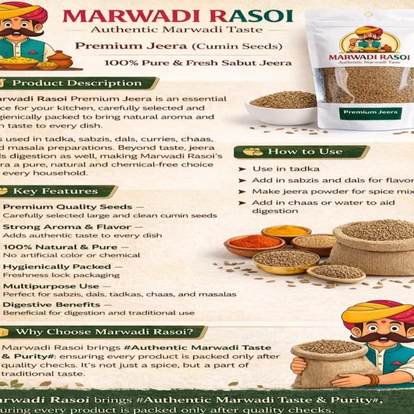 Marwadi Rasoi ka Premium Jeera aapke kitchen ke liye ek essential spice hai, jo har dish me natural aroma aur