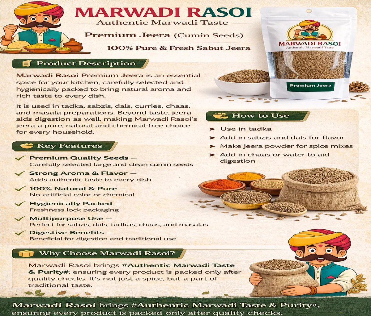 Iska use tadka, sabzi, dal, curry, chaas aur masala preparation me hota hai. Jeera na sirf taste badhata hai balki digestion me bhi madad karta hai. Marwadi Rasoi ka ye jeera bilkul shudh, natural aur chemical-free hai, jo har ghar ke liye perfect choice hai.